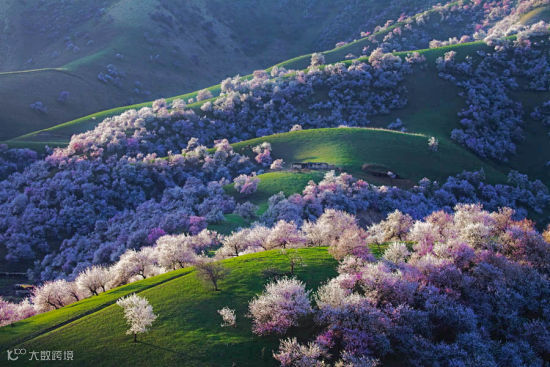 新疆新源县有一片中世纪遗留下来最大的原始野杏林,每年的4月10号到20号之间开花,花期一般在4-5天,早上日出时间8点,晚上落日20点30分左右。面积约3万余亩,杏树林在沟沟壑壑,绵延十几公里,山坡上野杏花竞相开放,或雪白或粉红的杏花,弥漫着明朗鲜艳的气息,几公里之外,都能闻到清新的杏花香味,相当的震撼。