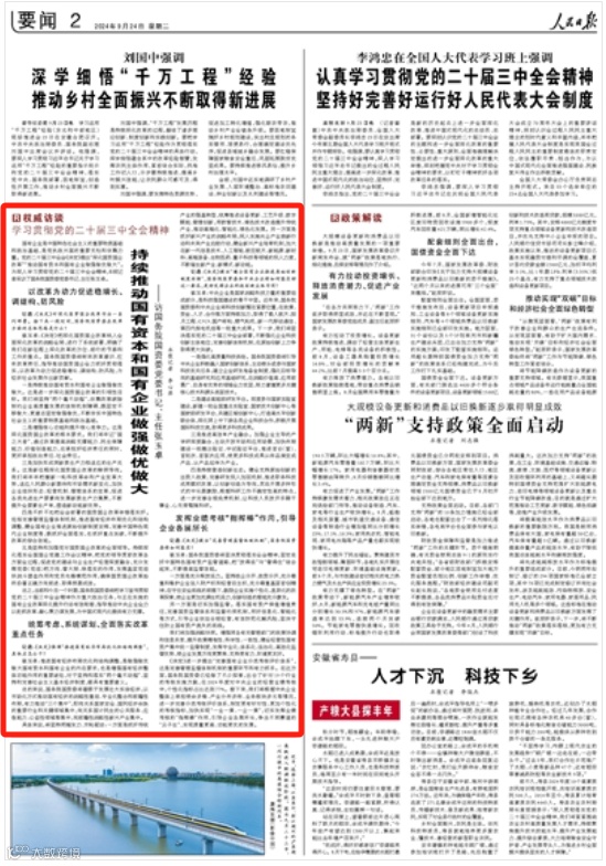 党的二十届三中全会《决定》提出“深化国资国企改革”“推动国有资本和国有企业做强做优做大”。《人民日报》9月24日刊发《持续推动国有资本和国有企业做强做优做大(权威访谈·学习贯彻党的二十届三中全会精神)——访国务院国资委党委书记、主任张玉卓》,全文如下。