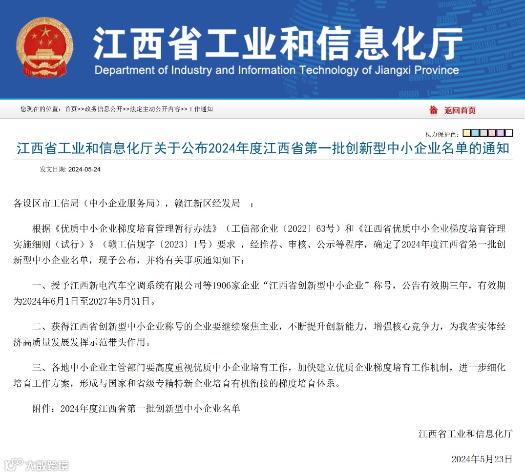 近日,江西省工业和信息化厅正式公布了2024年度江西省第一批创新型中小企业名单,