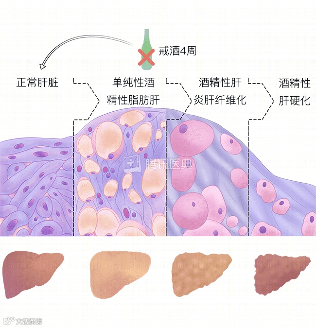 初期通常表现为脂肪肝,可进一步发展成酒精性肝炎、肝纤维化、肝硬化。