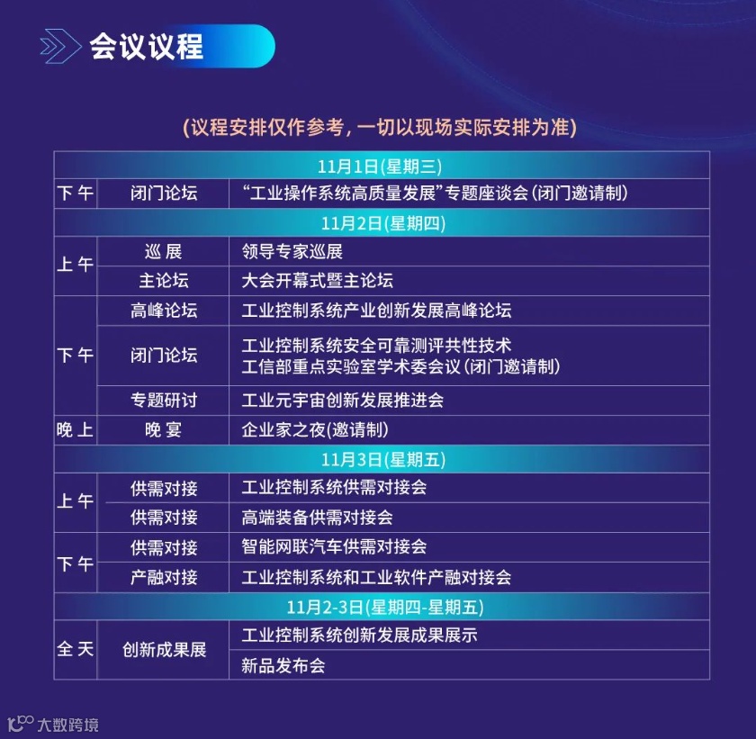 本次大会环节内容设置丰富,大会议程包括“工业操作系统高质量发展”专题闭门座谈会、工信部重点实验室学术委会议、工控系统和工业软件产融对接会、高峰论专题研讨会、行业供需对接会、工业控制系统创新发展成果展示和新品发布会等。
