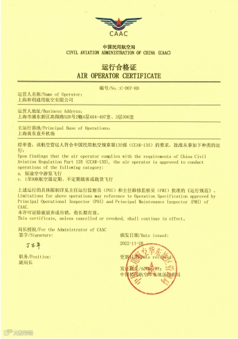 2022年11月28日,根据《小型航空器商业运输运营人运行合格审定规则》(CCAR-135部)最新规定,我司在严格遵守规章标准和审定工作程序的基础上,先后经过政策咨询、正式申请、文件审查、现场验证检查,通过了民航华东地区管理局CCAR-135部运行合格证换证审定各阶段的工作,编号:C-007-HD。标志着公司在能力建设、运行种类和市场领域方面迈上了新台阶。