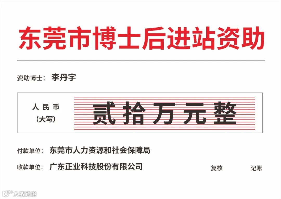 近日,正业科技李丹宇博士获得东莞市人力资源和社会保障局颁发的20万元资助基金。