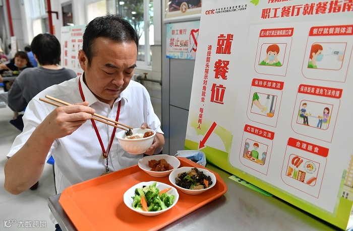 连日来,全国各机关单位、餐饮企业通过加强宣传、推出半份菜和小份菜等措施,积极营造厉行节约、反对浪费的餐饮风尚。图为2020年8月19日,中国电子科技集团公司第二十研究所一名员工选择半份菜用餐。新华社记者 张博文 摄