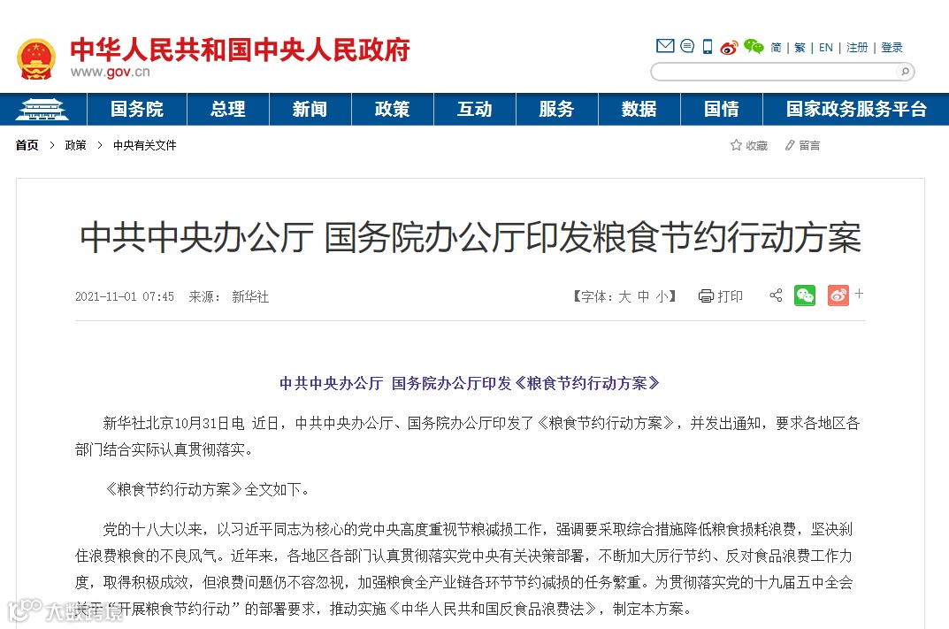近日,中共中央办公厅、国务院办公厅印发了《粮食节约行动方案》。(图片来源:中华人民共和国中央人民政府网站)