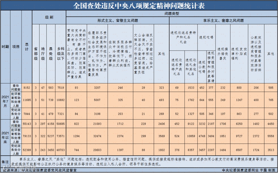 8月26日,中央纪委国家监委公布了2021年7月全国查处违反中央八项规定精神问题汇总情况。