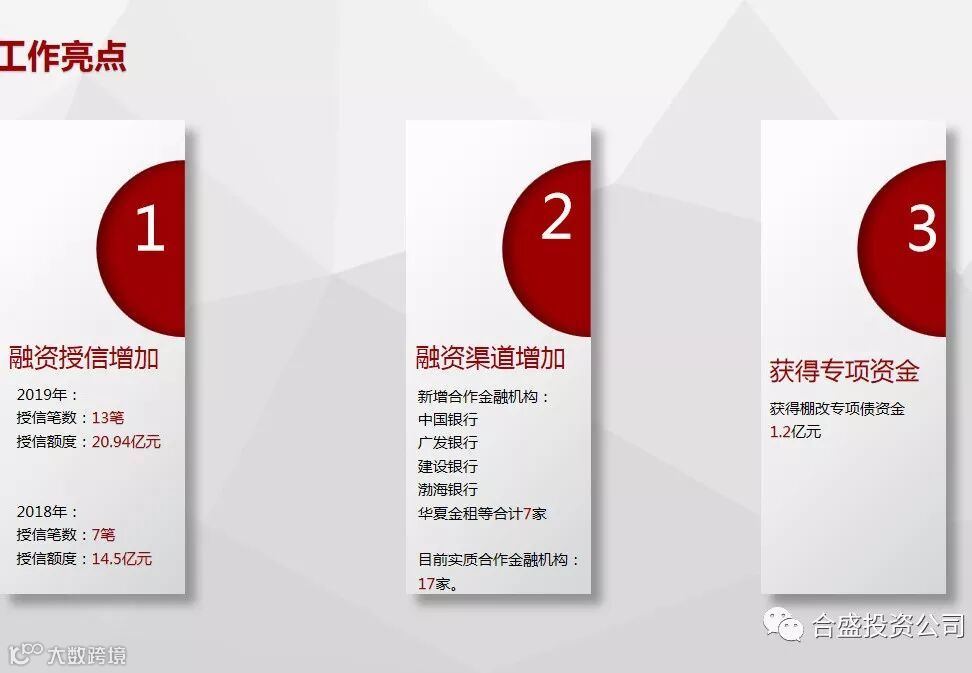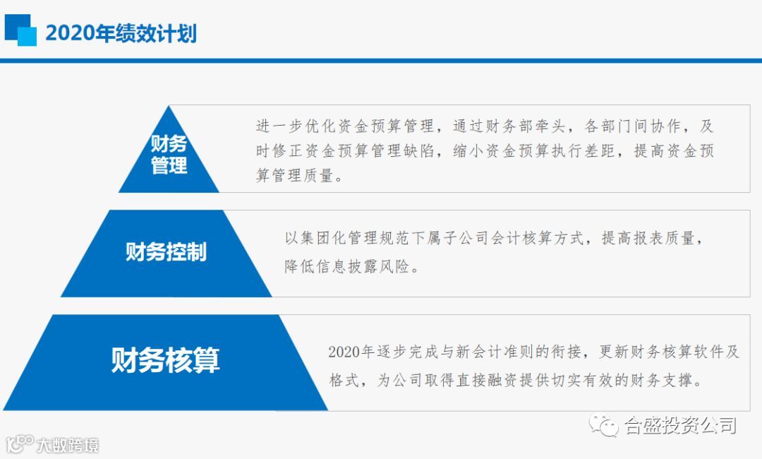 融资部部长王海涛向我们展示了本年度在“授信额度、融资渠道、专项资金、团队建设”上的工作内容和成果。提出AA级外部信用评级、资金需求、拓宽融资渠道、队伍建设等具体目标。