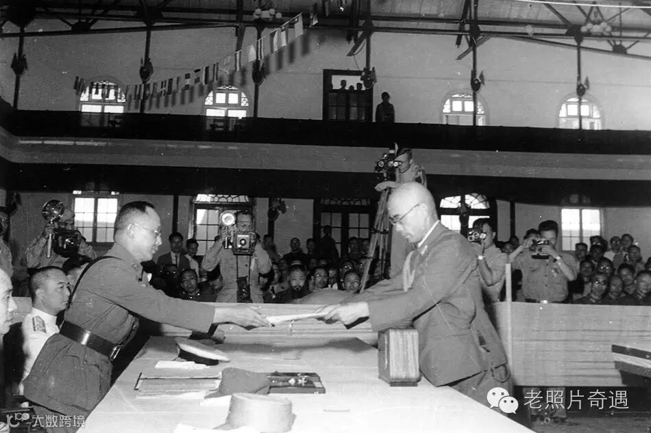 南京受降仪式上,中方使用的桌子很宽,大约是日方的三倍。中方代表坐皮包椅,日方代表坐布包椅。图为日军总参谋长小林漫三郎向中国陆军总司令何应钦呈递降书。何应钦在接受降书时,因弯腰而被指亲日。