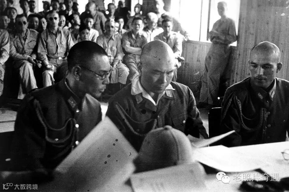 在芷江会场,日本代表向中国政府交出陆海空侵华兵力分布图,签署了投降备忘录。当日中方代表是陆军总参谋长萧毅肃和副总参谋长冷欣,日方代表有人不时擦汗。图为今井武夫(中)阅读何应钦要求转交给冈村宁次的《中字第一号备忘录》。