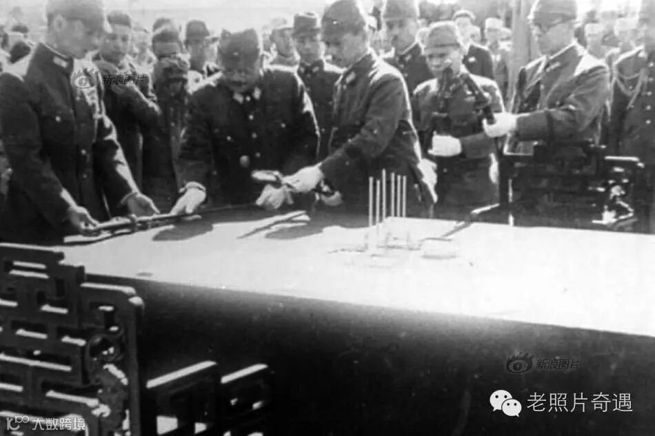 根据麦克阿瑟的命令,“日军缴械时不举行收缴副武器之仪式”,所以在中国各战区,都没有举行官方的献刀仪式,但华北战区除外。孙连仲要求日军将领在第十一战区受降仪式上献刀。图为日方代表献刀。