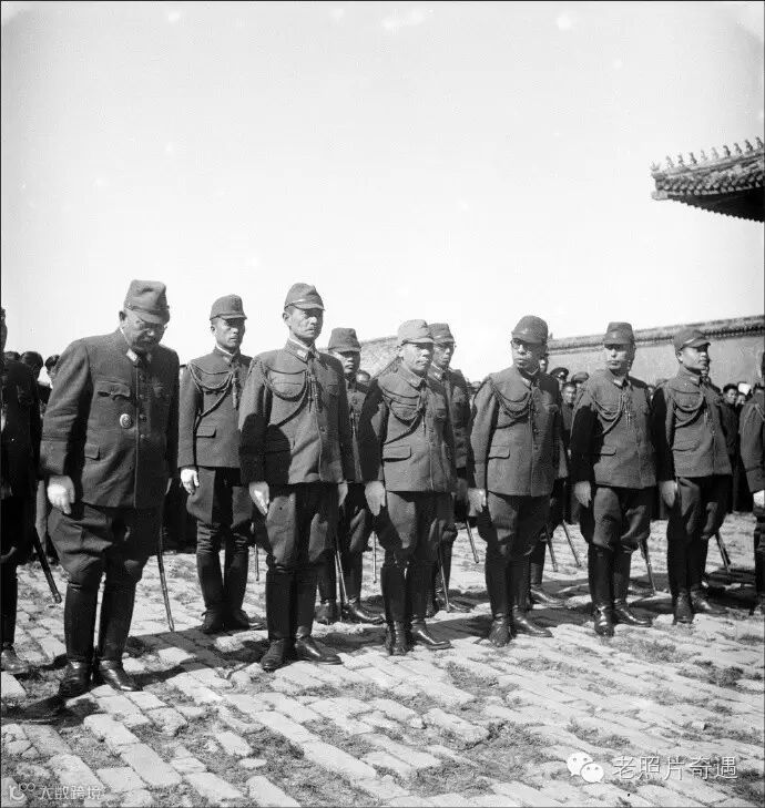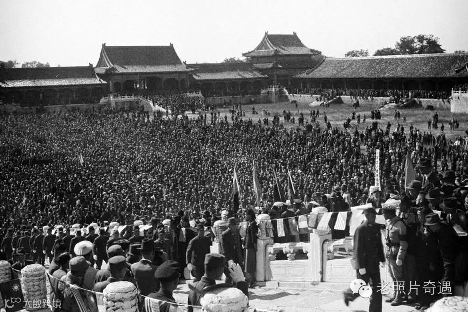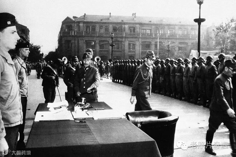 1945年10月10日,北平秋高气爽,中国华北战区的受降仪式在故宫太和殿前举行。上午10点,当景山的汽笛长鸣后,受降仪式正式开始。当日,日方代表有60人,由日军华北方面司令官根本博中将率领;中国受降主官为第十一战区司令长官孙连仲上将。图为日方代表入场投降。