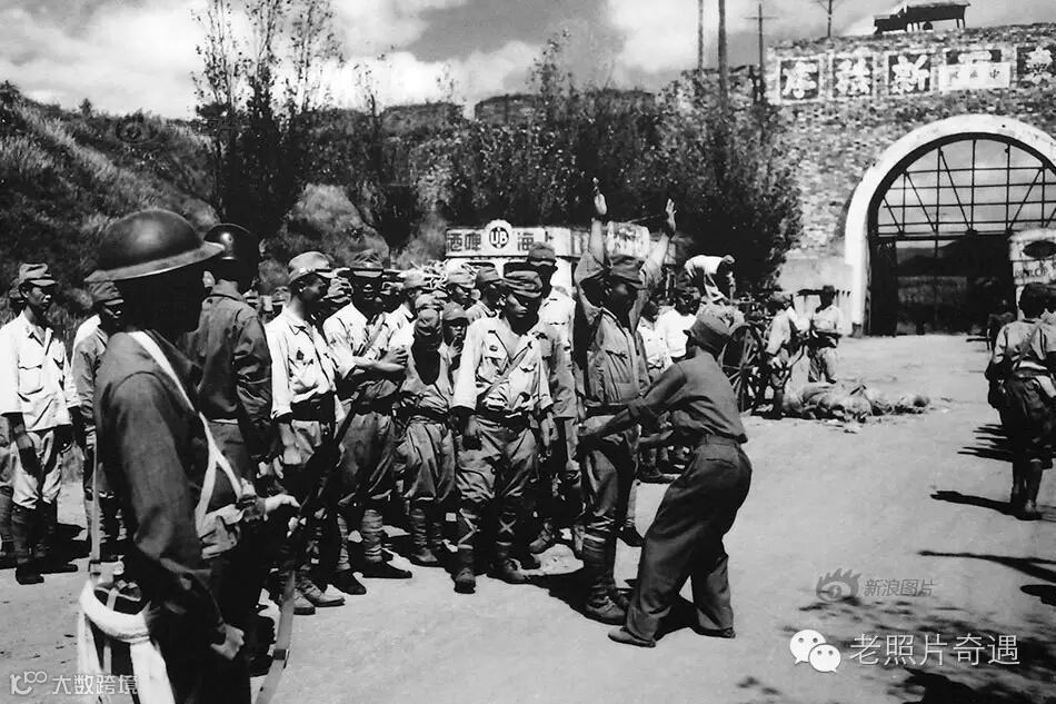 依据蒋介石的“以德报怨”政策,已经办理投降宣誓手续的日本官兵,不称战俘,而称作“徒手官兵”;“徒手官兵”纳入国民政府军的补给体制,与国军官兵拿同等薪资。图为1945年10月,安徽芜湖,投降后的日军步出城门前往集中营时,接受中国军官点验部队。