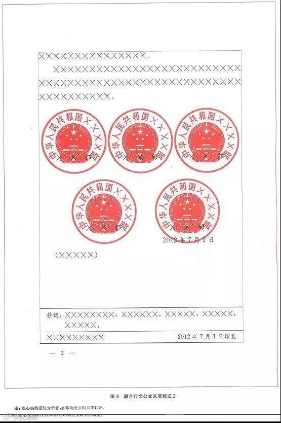 各发文机关署名要按照发文机关顺序整齐排列在相应位置,(当联合行文需加盖3个以上印章时,为防止出现空白印章,应将各发文机关名称排在发文时间和正文之间)每排印章两端不超出版心,首排印章应当上距正文(或附件说明)一行之内,机关顺序整齐排列在日期、印章之间排列整齐,互不相交或相切,成文日期居右空4字。