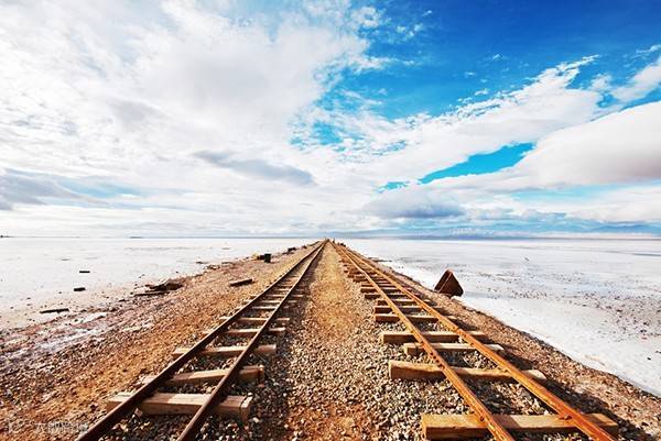 茶卡盐湖最吸引人的地方就是它那条通往湖心的铁轨,空旷的盐湖,直直的铁路,歪歪扭扭的电线杆,颇有一番末日的景象。从入口到铁轨处有个一两公里,把车停在铁轨起点处几座硕大的盐雕跟前。然后步行进入盐湖。