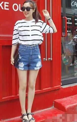 搭配TIPS:破洞蓝牛+黑白条纹中袖T+墨镜+黑色手拿包+黑色凉鞋