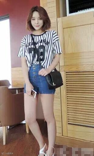 搭配TIPS:蓝牛+黑白条纹字母T+黑色包包+白色凉鞋