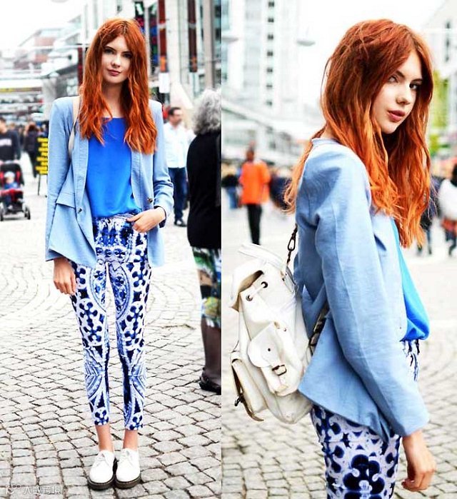 蓝色搭配红色,使人显得妩媚、俏丽,但应注意蓝红比例适当。