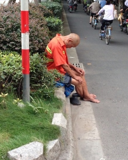 天这么热,只见老大爷光着脚丫眯了眼,一定很累啊,
