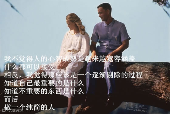 21.《阿甘正传》:我不觉得人的心智成熟是越来越宽容涵盖,什么都可以接受。相反,我觉得那应该是一个逐渐剔除的过程,知道自己最重要的是什么,知道不重要的东西是什么。而后,做一个纯简的人。