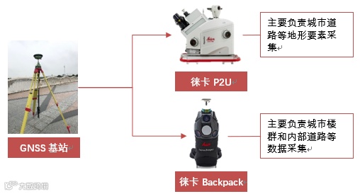 本次外业采集,首先根据已有的底图进行项目规划,将主要的采集对象进行分类,道路及车辆能通行的区域使用P2U进行外业采集,车辆无法同行的内部道路、楼群的采集使用移动背包来进行采集。采集的作业流程如下: