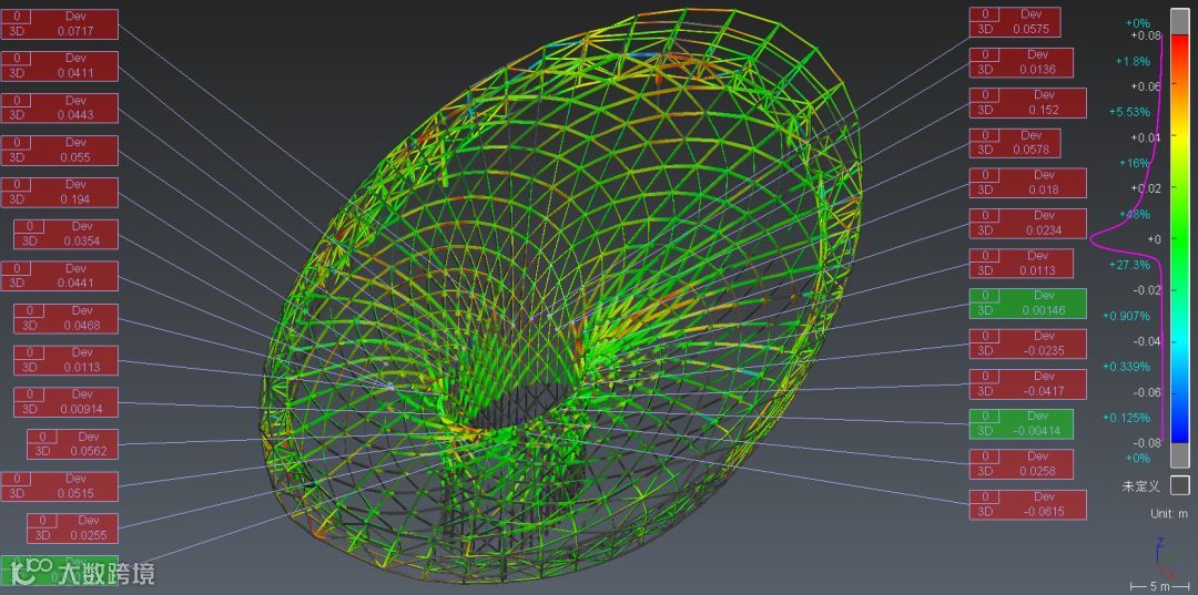 1、对钢结构进行全面扫描,点云成果坐标匹配到施工坐标系下;结合设计模型,提供变形分析报告;