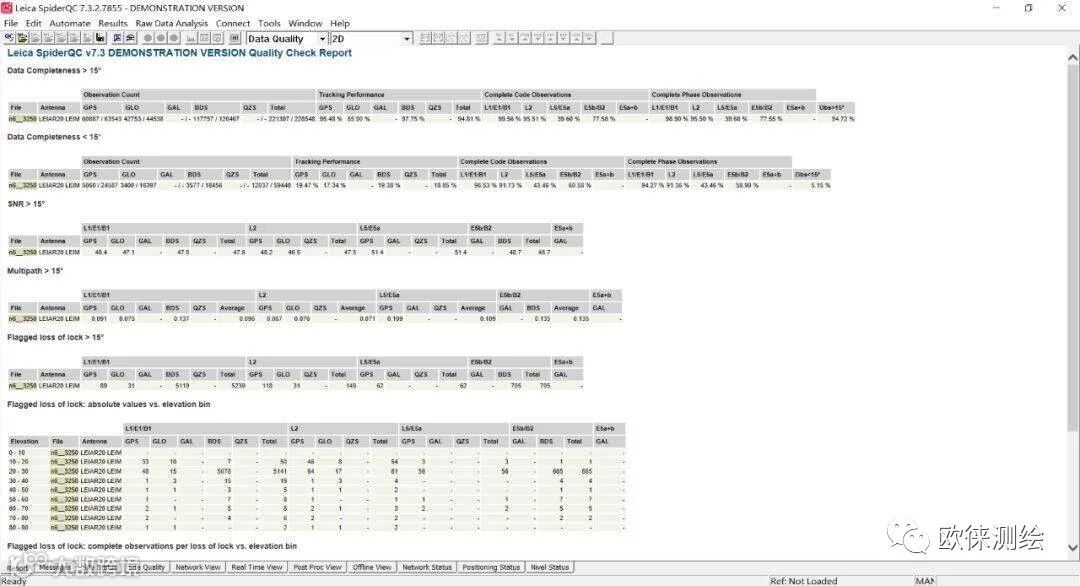 徕卡SpiderQC软件是专业的GNSS数据质量分析软件,并可进行自动/手动数据质量监测。可提供了关于卫星跟踪,多路径,周跳,信噪比和数据间隙等关键性能指标,并可进行实时数据监测与查看。