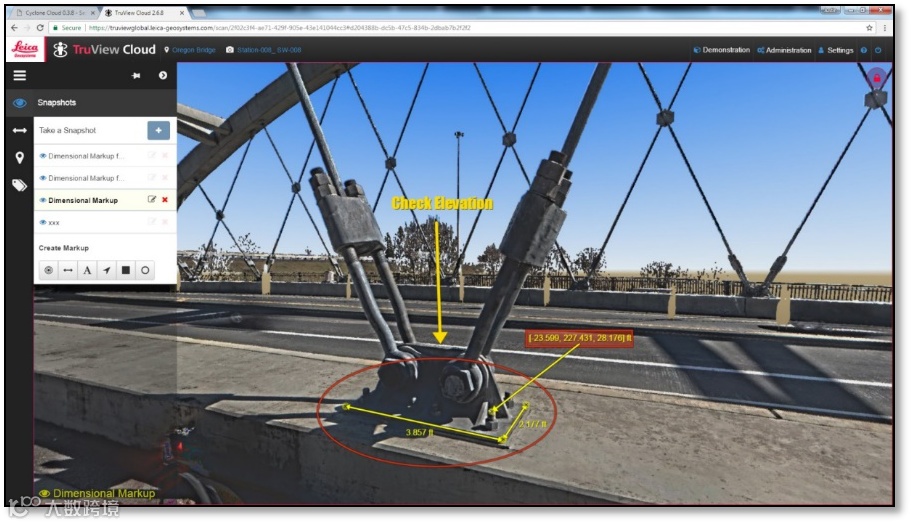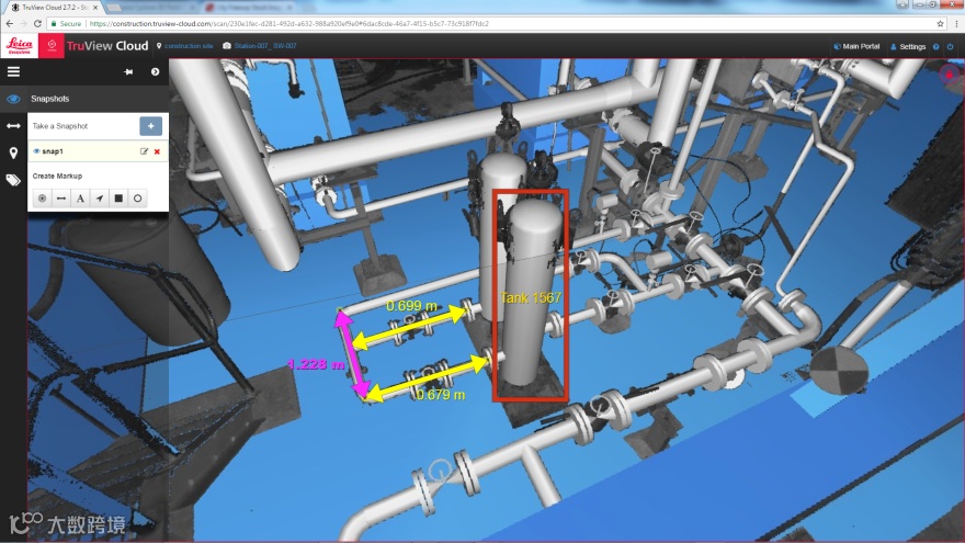 徕卡TruView不仅可以以三维实景进行显示,通过点击图像上的点还能可获取该点的三维坐标,点击两个点来便能测量两点距离,结果直接显示在点云图像上,不去现场也能轻松测量现场数据。
