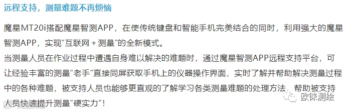 魔星(Gemax)隶属于全球领先的测量技术集团海克斯康,是海克斯康的全新品牌。魔星(Gemax)致力于将海克斯康卓越的测量技术与前沿的互联网等技术进行融合,为广大测绘用户提供“轻松、愉悦、创新、节省”的互联网测量产品。魔星MT20i让用户充分享受到“数据一键分享”、“一键数据下载”、“远程专家支持与培训指导”、“按需付费”等互联网功能的便利,让建筑施工测量“i”起来!