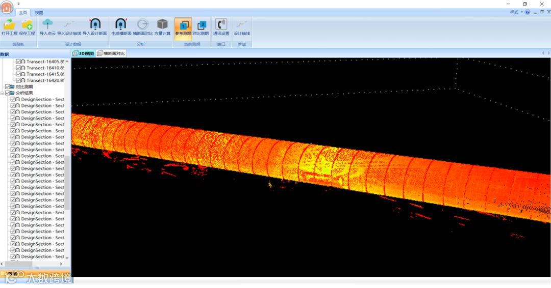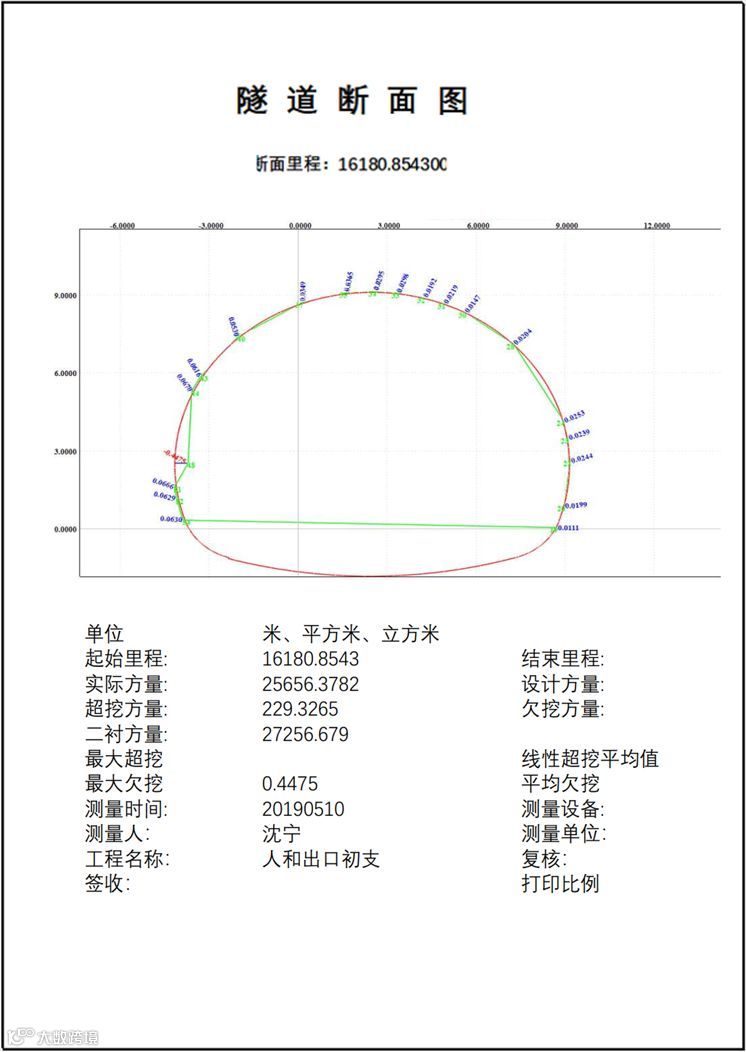 一次作业的数据就可以实现超欠挖断面分析、方量计算、衬砌分析、侵限分析等多中功能成果: