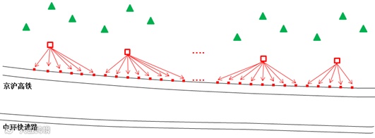 如图2所示,京沪高铁(上)与中环快速路(下)并行,监测点将设置在高铁桥墩之上,每隔一段距离设置一个工作基点,监测对应桥墩上的棱镜,判断桥墩的平面变化情况,通过水准仪往返测量判断高程变化情况。