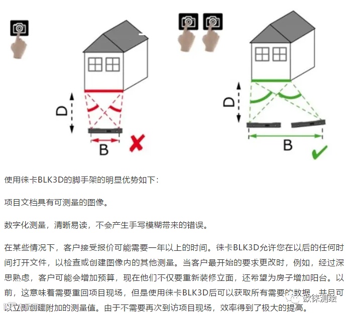 除了单照片测量外,徕卡BLK3D还具备多照片测量功能,这意味着可以将不同位置拍摄的同一场景的两张照片叠加,通过延长基线的长度,提高3D测量和3D建模的精度。