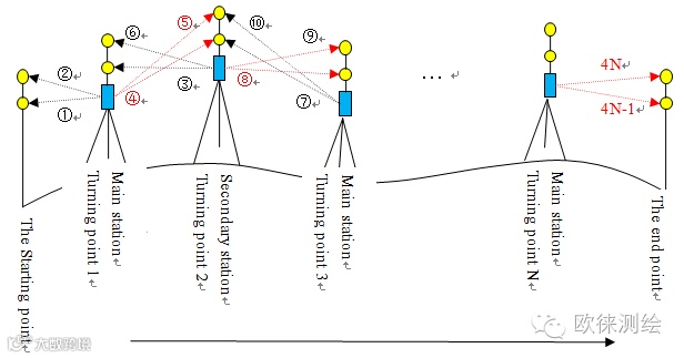 观测过程中需要两台全站仪,观测线路应保证偶数测段,架设仪器为奇数次,每个奇数点架设的仪器应当相同;每一个偶数点架设的仪器应当为同一台设备。