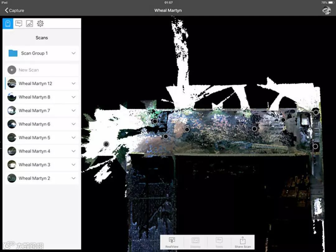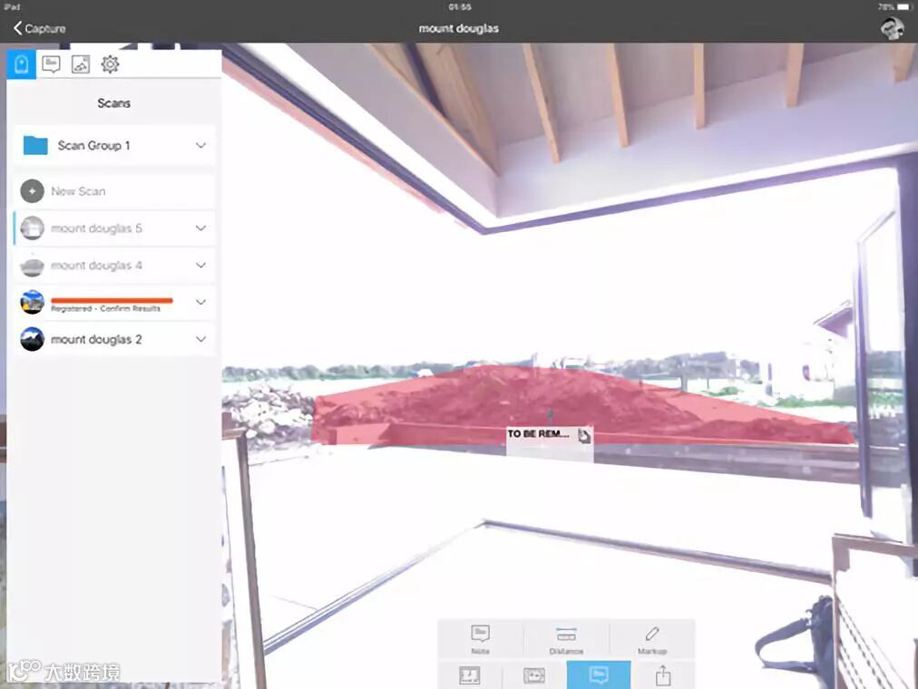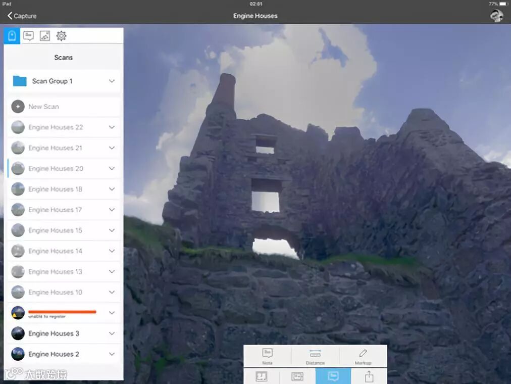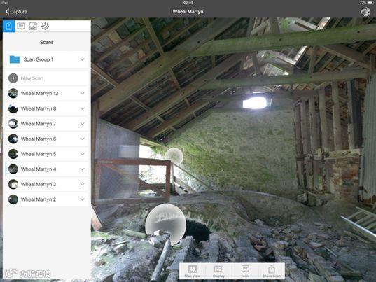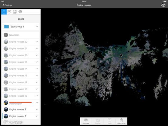 Recap Pro的附加功能包括:在视图中查看场景,观察每站之间的位置关系,在扫描成果中做一个文本、照片、彩色标记,或测量任意两点的距离。在扫描时可以使用这些功能,但我们不建议这样做,因为同时进行多项操作会影响扫描进度。因此,在使用Recap Pro应用程序中添加任何注释、照片、或标记之前,只进行扫描,在办公室里将iPad通过USB连接到Autodesk Recap Pro,对数据进行手动拼接可以提高精度。