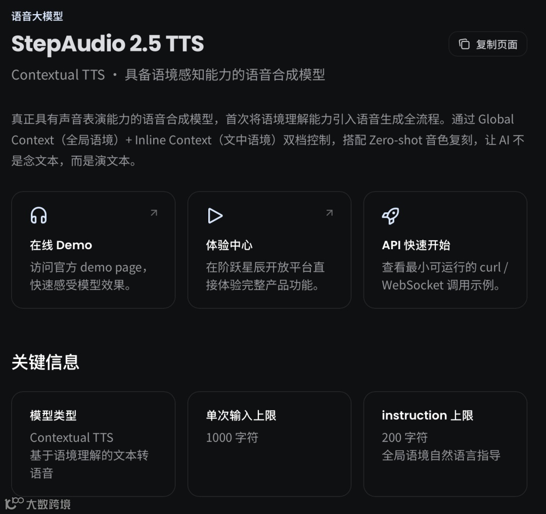 StepAudio 2.5 TTS在情感表达的真实性和语音复刻上更为深入,模型升级了语境控制、零样本复刻与全音色控制,支持自然语言合成控制,主要面向角色配音、有声内容创作和智能语音交互等场景,已上线平台。