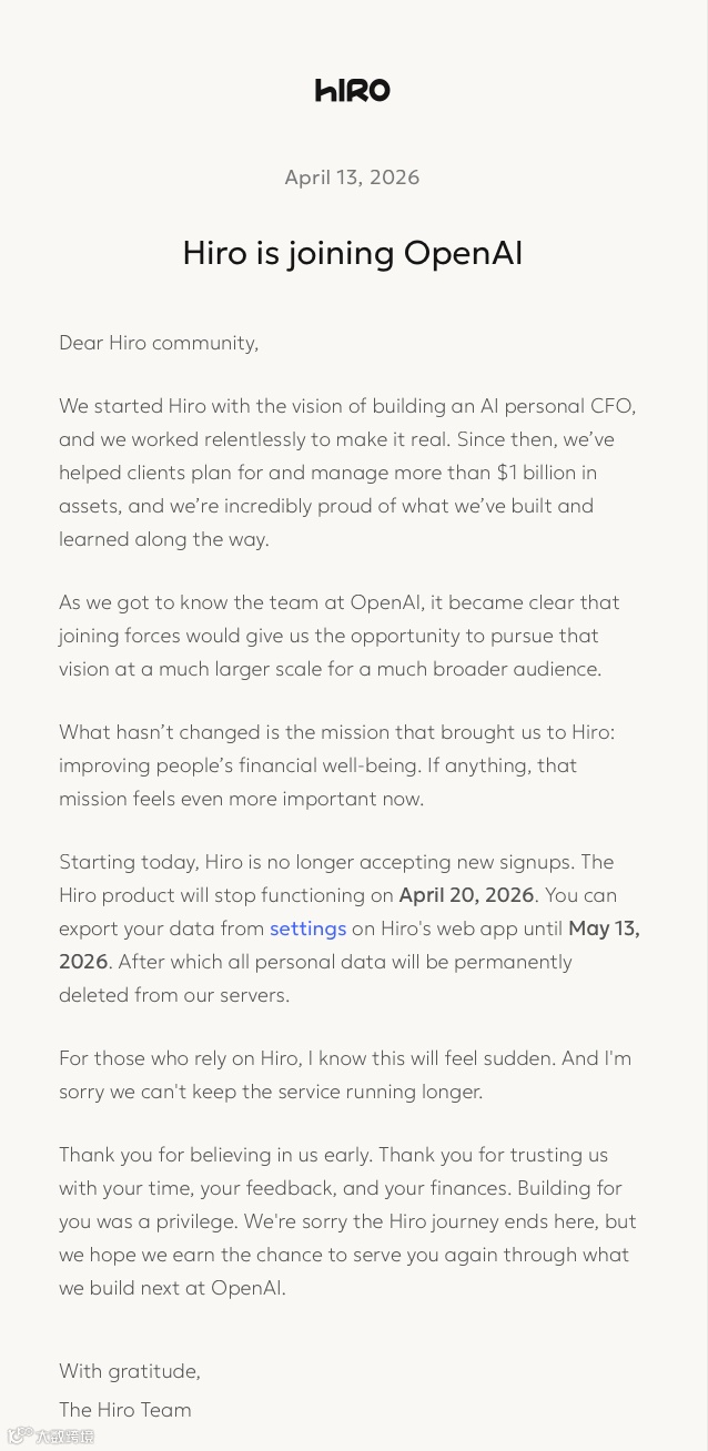 OpenAI已收购AI个人理财初创公司Hiro Finance,该公司将于4月20日停止运营,5月13日前删除所有服务器数据,创始人Ethan Bloch及员工将加入OpenAI,实质上属于人才收购。