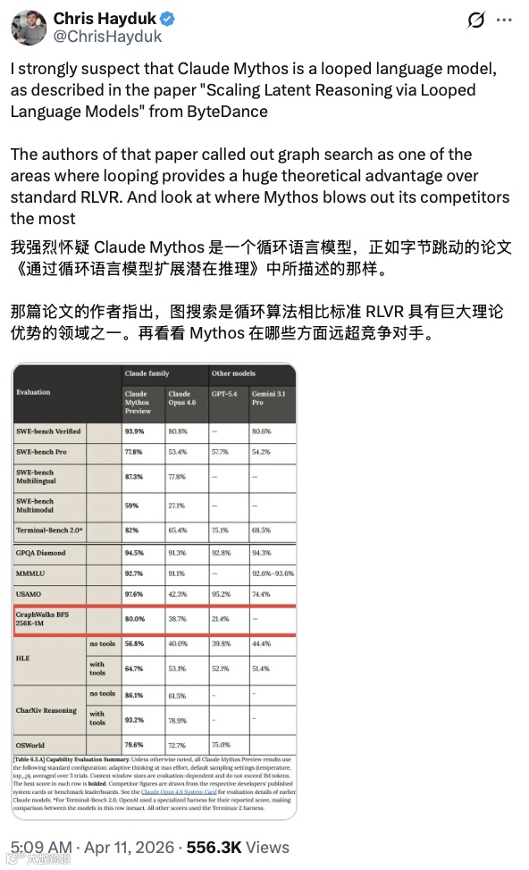 同时,本周Anthropic发布大语言模型Claude Mythos Preview,在GraphWalks BFS中得分80.0%,远超GPT-5.4的21.4%和Claude Opus 4.6的38.7%。