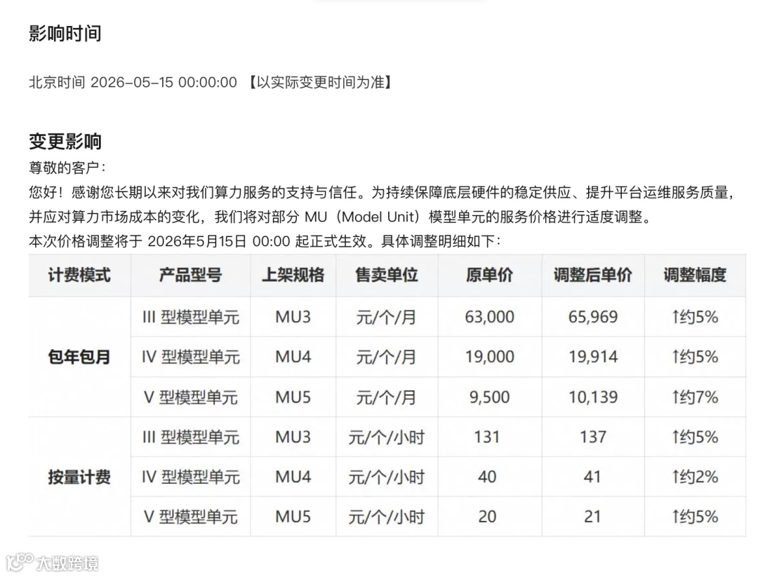 1.阿里云5月15日起上调MU模型单元价格