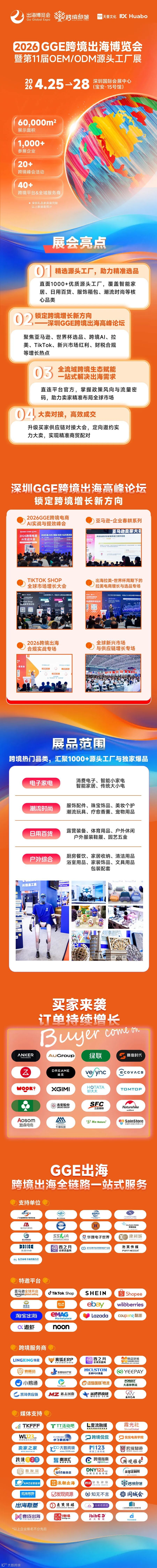 4月25日至28日,深圳将举办2026 GGE跨境出海博览会,集结6万㎡展馆、1000+源头工厂及40+主流平台,提供一站式解决方案。