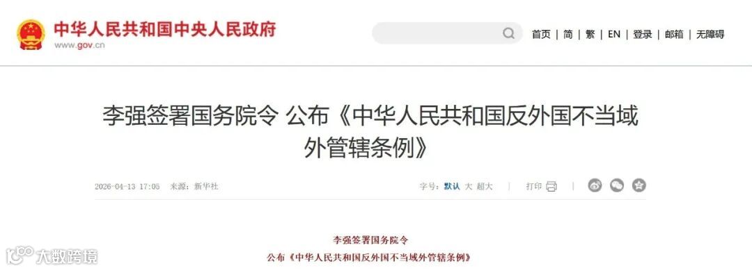 4月13日,国务院公布《中华人民共和国反外国不当域外管辖条例》(以下简称《条例》),自公布之日起施行。