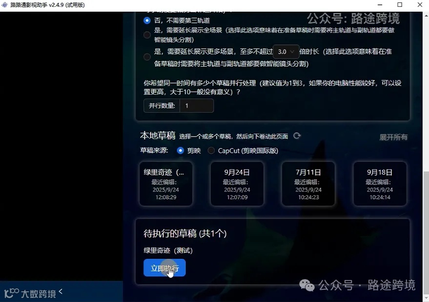 使用时将对标视频与原片导入剪映,软件识别草稿后点击执行: