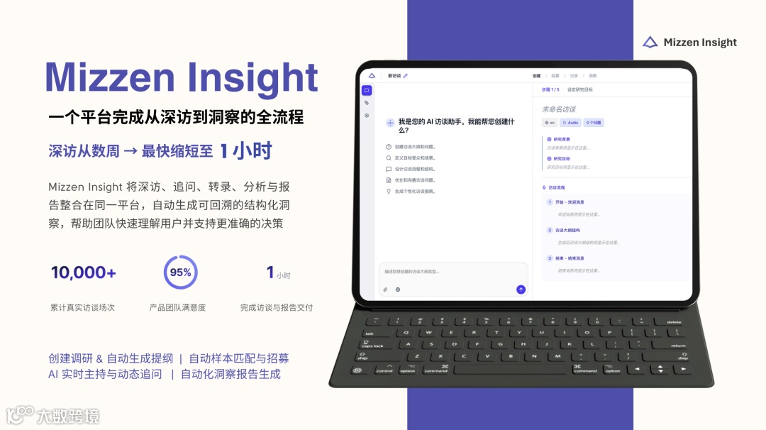 Mizzen Insight通过云原生架构实现技术突破:自动生成访谈提纲、支持数百路AI并发访谈、具备动态追问能力,结合智能分析实现分钟级可视化报告输出,全流程解决“慢、贵、难”痛点。