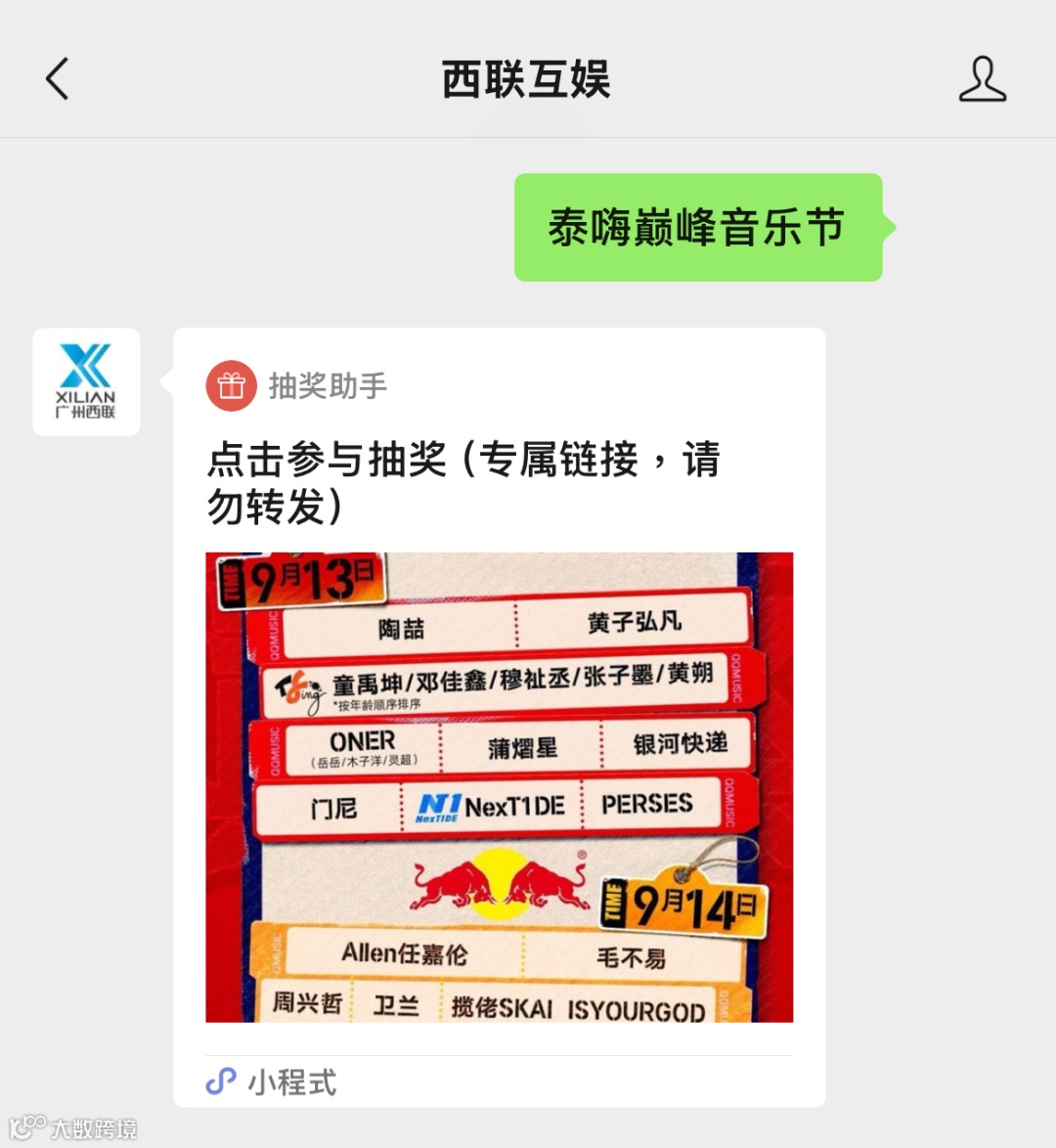 step3:公众号后台发送“泰嗨巅峰音乐节”文字口令,即可获取抽奖活动链接(如下图)