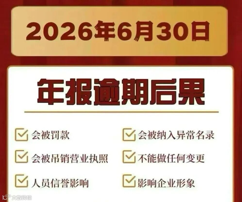 2025年12月31日前登记的企业及个体工商户,须在2026年1月1日—6月30日完成年报申报。逾期将列入经营异常名录,该记录永久留存,直接影响贷款、招投标、政府采购等核心业务,并可能面临1万元以下罚款。