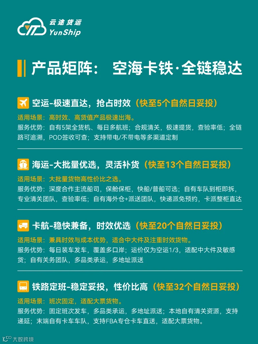 云途货运覆盖美国、欧洲等主流市场,提供四大核心产品: