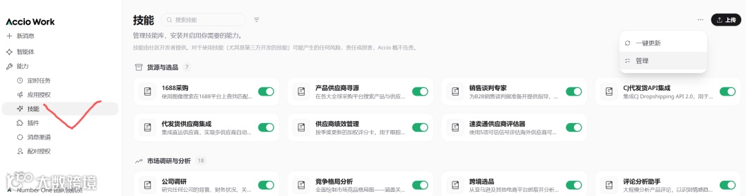 Accio Work内置100+技能,按需安装。避免安装未使用技能以减少积分消耗。