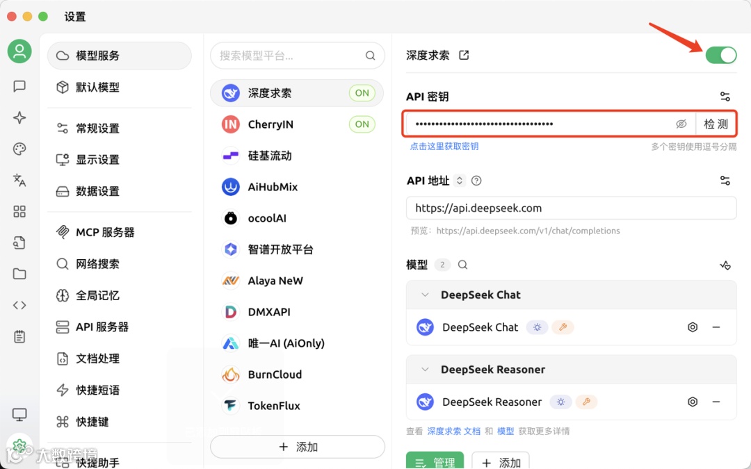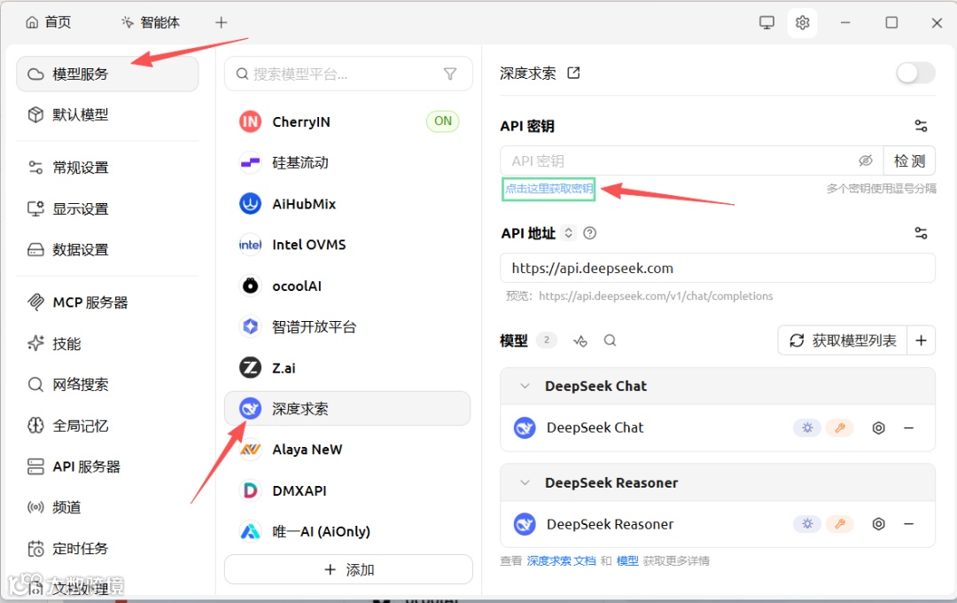 1. 进入【设置】→【模型服务】,选择目标AI大模型(以DeepSeek为例)