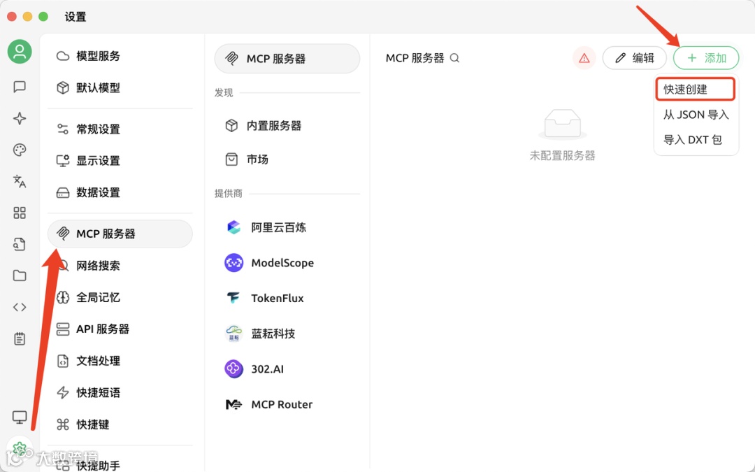 3. 在Cherry Studio【设置】→【MCP服务器】点击【+添加】,选择【快速创建】