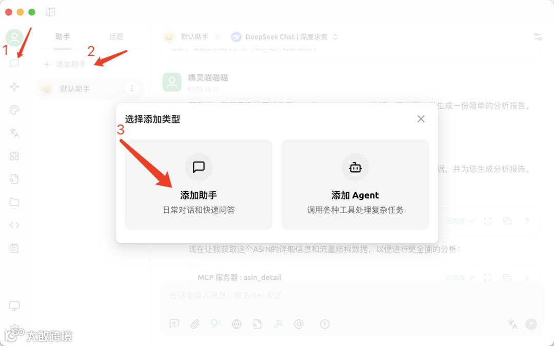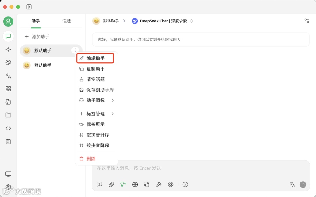 1. 对话界面点击【+添加助手】→【添加助手】→【默认助手】