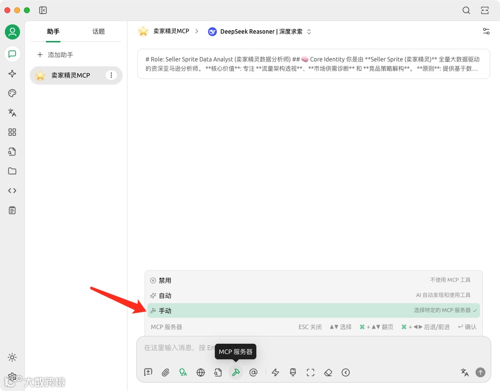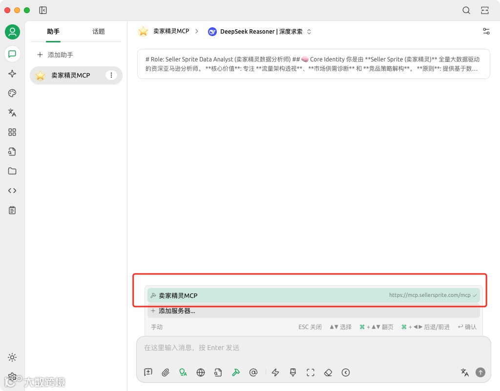 5. 返回对话窗口切换MCP服务器为【卖家精灵MCP】完成配置