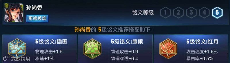 隐匿移速方便孙尚香更好的移动寻找输出位置,团战支援也比较迅速,物理攻击可以提伤害。绿色鹰眼,穿透护甲后孙尚香的攻击伤害会更高。红色红月,提高攻击速度和暴击率也很重要。